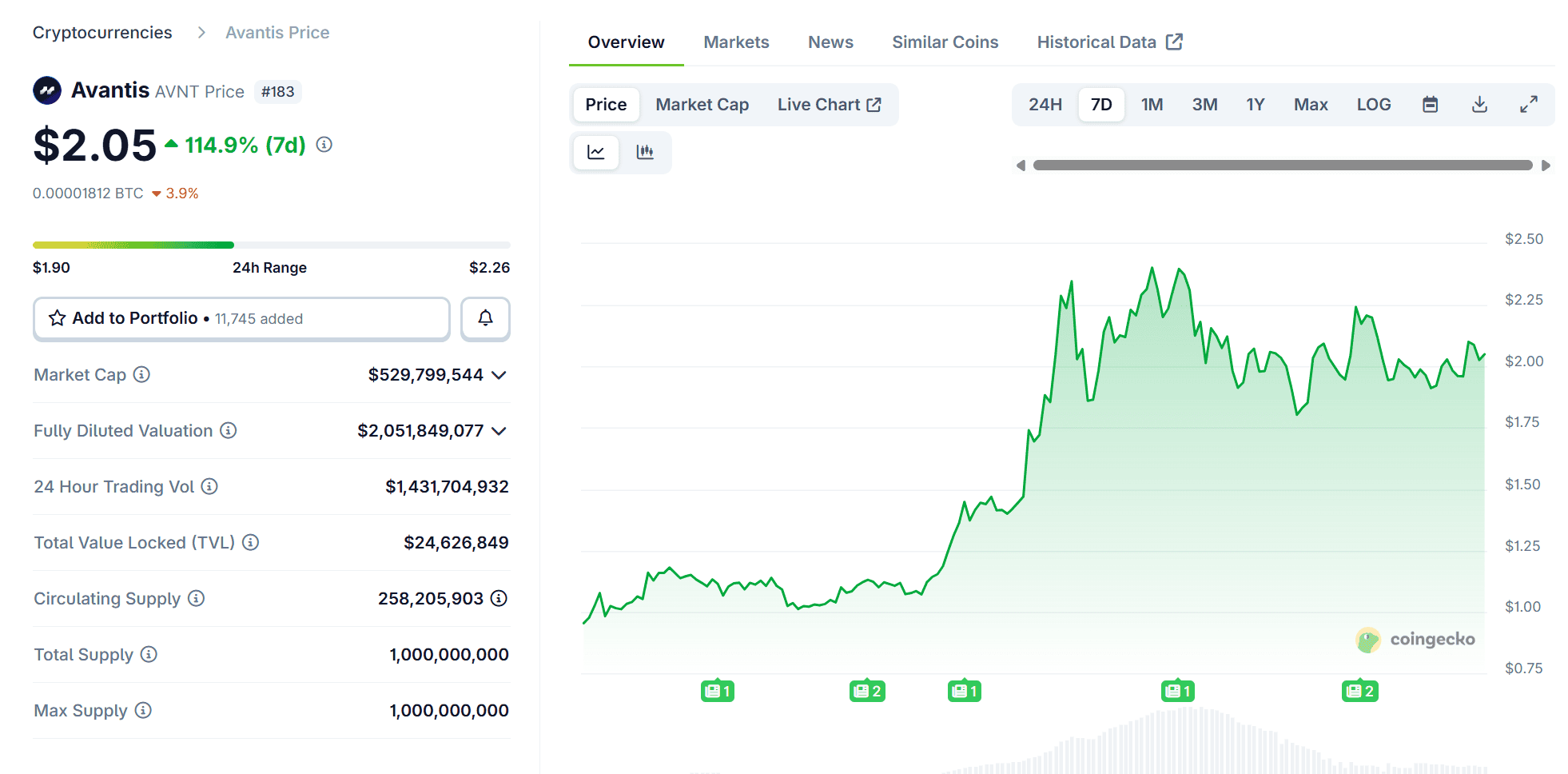 The token has already 5x’d since its launch two weeks ago. More recently, the Avantis crypto token price pumped 66% in a week and 641% over the past month, while its TVL climbed 27%. Not bad for a brand-new project.