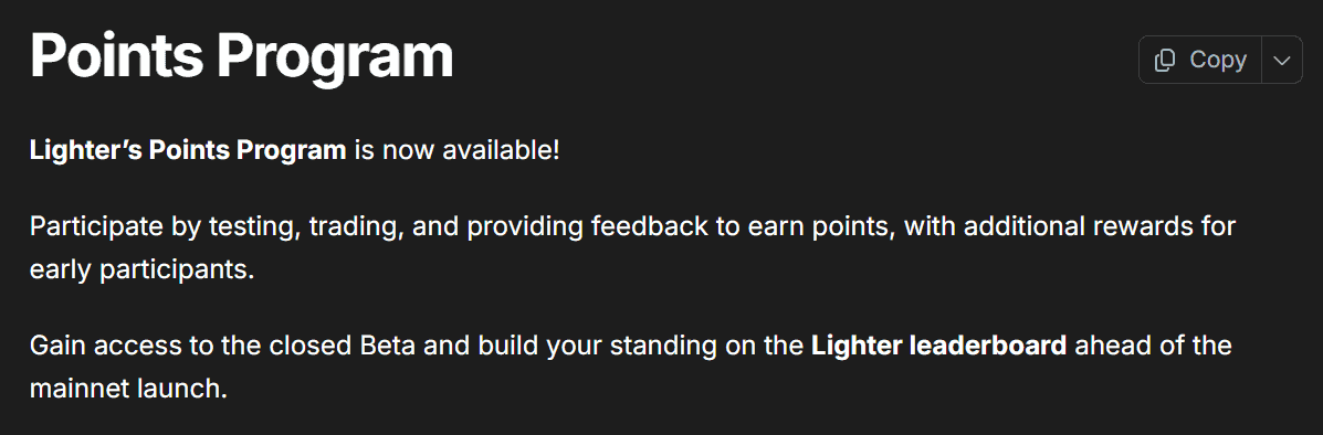 Although no token, Lighter is running a Points Program that looks a lot like pre-airdrop farming. Users can earn points mainly by trading perpetuals, inviting new users, and joining competitions, with leaderboards tracking weekly rewards.