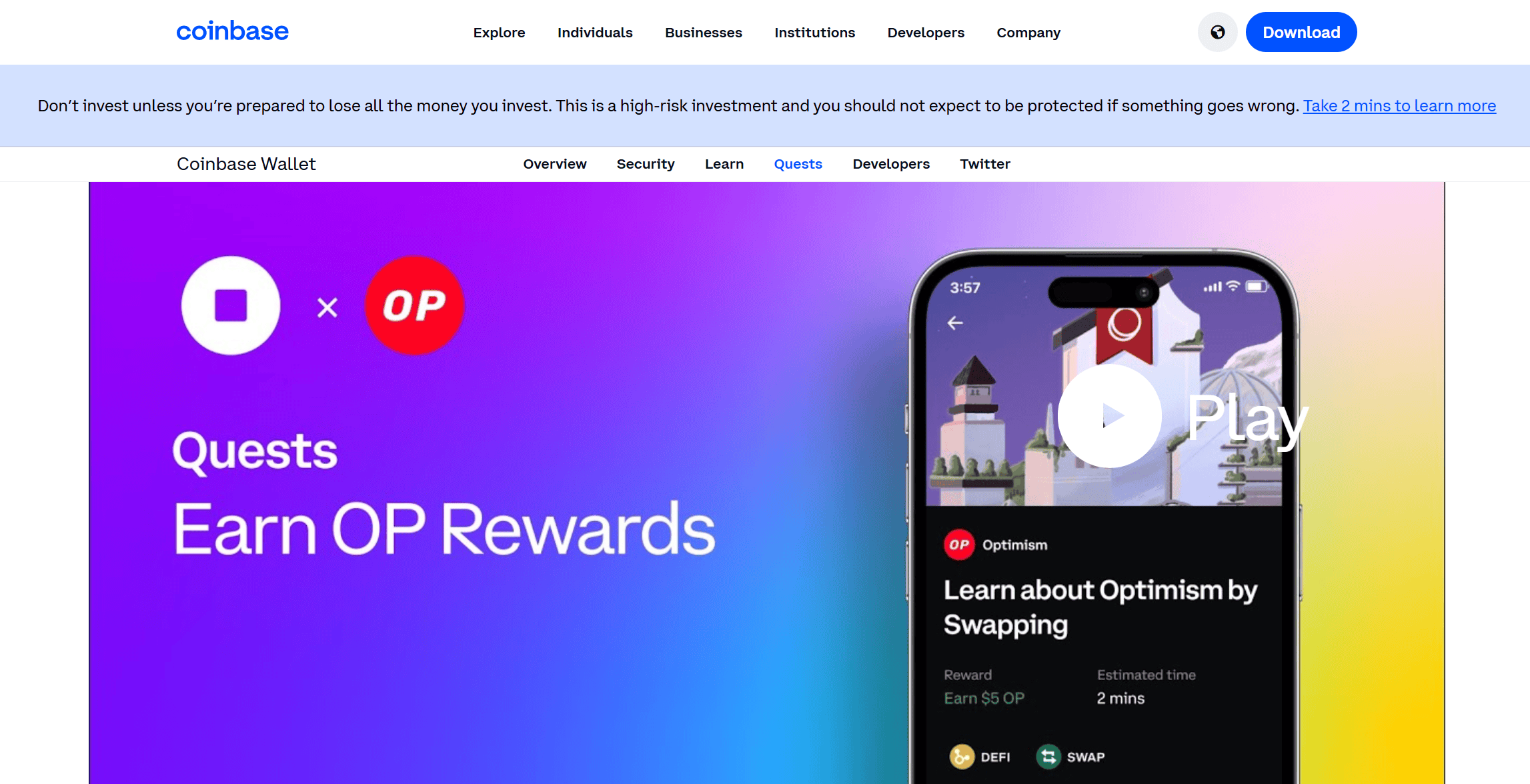 Coinbase Wallet Quests | Complete on-chain tasks (swap, stake, NFTs) in the Coinbase Wallet app | Small amounts of tokens | Beginners who want hands-on practice | May require gas fees. Not available in all regions |