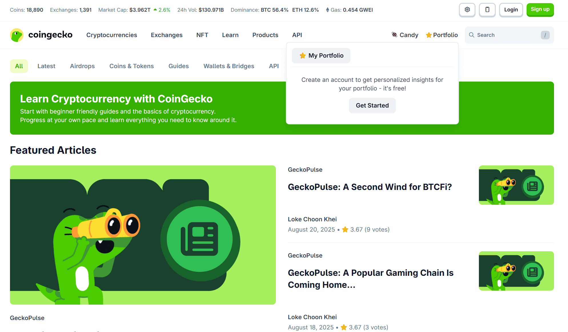 CoinGecko, best known as a crypto price-tracking website (similar to CoinMarketCap), also offers a Learn-to-Earn section. Lessons are short and approachable, usually a mix of videos and quizzes that focus on trending projects or basic crypto concepts.